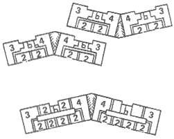 В зависимости от композиции застройки может быть применен разнообразный состав блок-секций. В условиях индустриального домостроения требования заводского производства диктуют необходимость сокращения числа блок-секций. Но и в этих условиях сокращенная номенклатура должна давать возможность решения различных градостроительных задач. В необходимую номенклатуру блок-секций обычно входят рядовые (торцовые) блок-секции (широтная и меридиональная), торцовые (левая и правая), универсальная по условиям ориентации трехквартирная угловая секция (с квартирами, ориентированными на две стороны горизонта). Для организации въезда во внутриквартальное пространство в серию включают вставки с проездом (рис. 21,6). При формировании непрямолинейных в плане зданий в полносборном строительстве предпочтительно применяют не косоугольные секции, а треугольные поворотные блокировочные вставки, в пространстве которых располагают летние или подсобные помещения квартир. Замена поворотной секции блокировочной вставкой позволяет сократить номенклатуру сборных изделий на 25—35%.